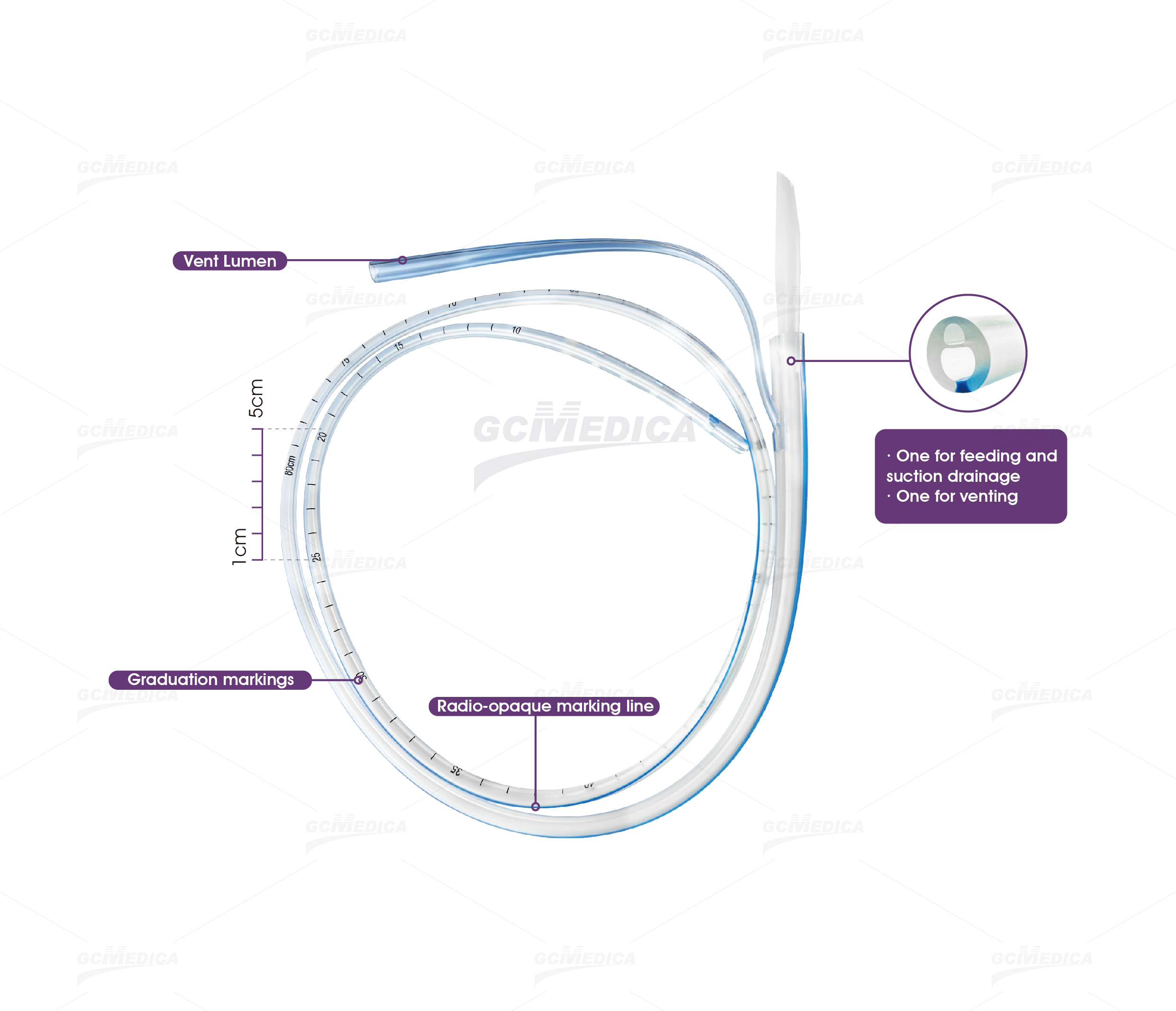 · Tubo de doble luz: la luz de mayor diámetro facilita la aspiración del contenido gástrico, la descompresión, la irrigación